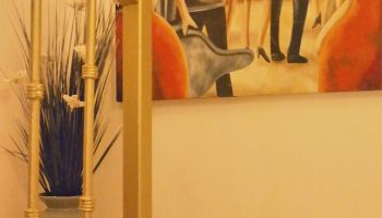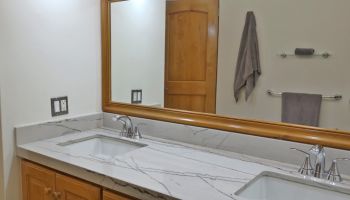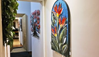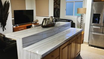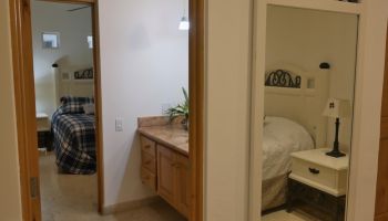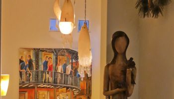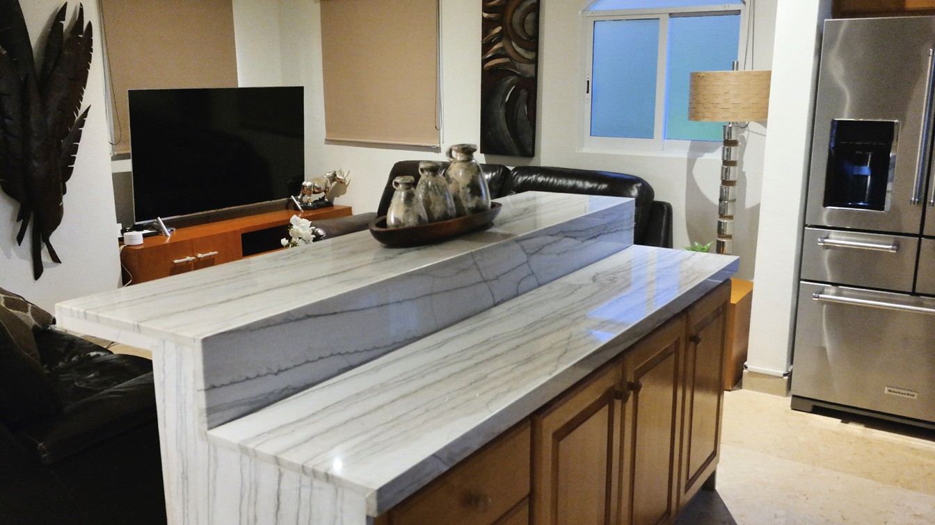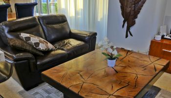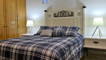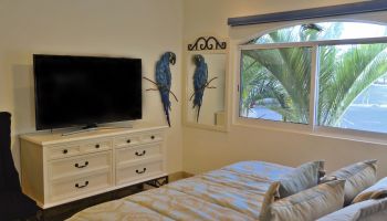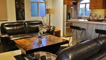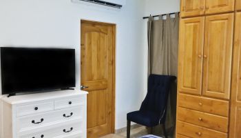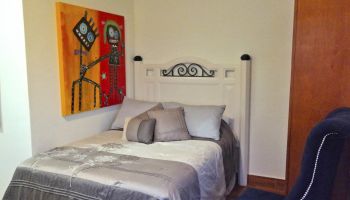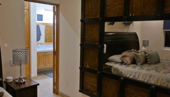 The villa has four bedrooms and two bathrooms on the lower level. (Sleeps 6.) Upstairs, you will find an office where you can work and sharing the space at the same time with a bed; full kitchen, laundry room, half bathroom, dining area, and a living room with access to terrace and an outside patio.
