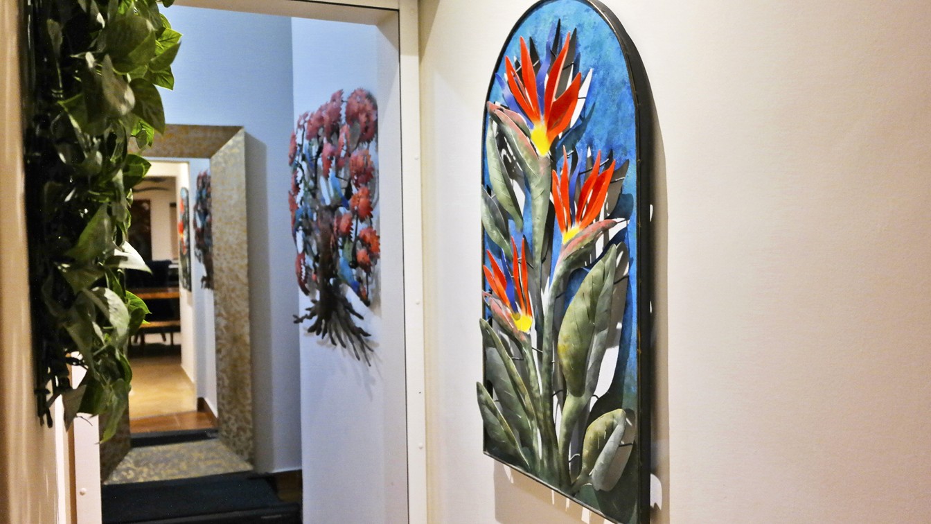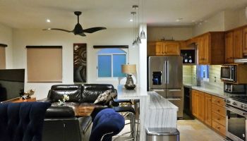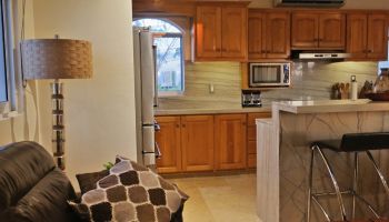 The villa has four bedrooms and two bathrooms on the lower level. (Sleeps 6.) Upstairs, you will find an office where you can work and sharing the space at the same time with a bed; full kitchen, laundry room, half bathroom, dining area, and a living room with access to terrace and an outside patio.